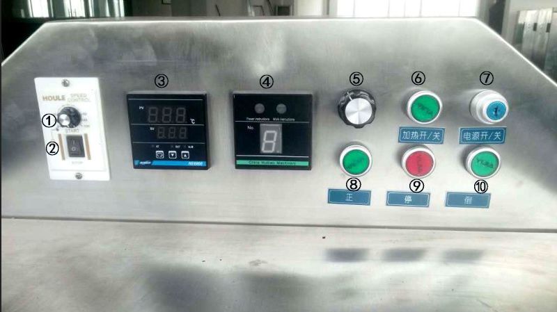 ①、調速器旋鈕(正面白色):用于調節炒鍋轉速,順時針調節加速,逆時針調節減速,可根據炒制品特性,適當調整。