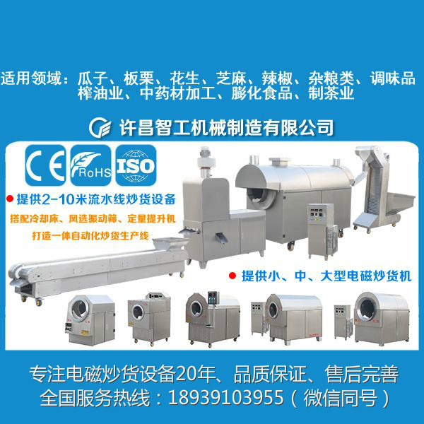 許昌智工電磁炒栗子機采用一鍵開機自動旋轉、一鍵自動翻炒、一鍵自動出鍋,半自動炒貨機整機采用進口不銹鋼板加工成形,外觀豪華氣派、美觀大方、清潔衛生,電燃炒貨機機器采用了先進的滾筒臥式結構,滾筒加熱均勻,并有保溫功能。利用鍋體與電磁線圈感應加熱,經營場地不受限制,節約費用,回報率高。降低成本,增大收入。