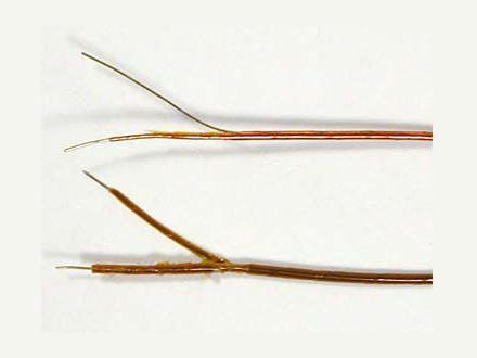 The standard wires come without TC connection at the end. As an option Allectra offers welded tips on bare or on the insulated wires. The tip can be left blank (best thermal contact) or electrically insulated with PTFE.